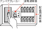 電気回路のどこかで漏電があると自動的に電気を止める装置です。漏電遮断機が働いた場合には次のような手順で原因を確認してください。